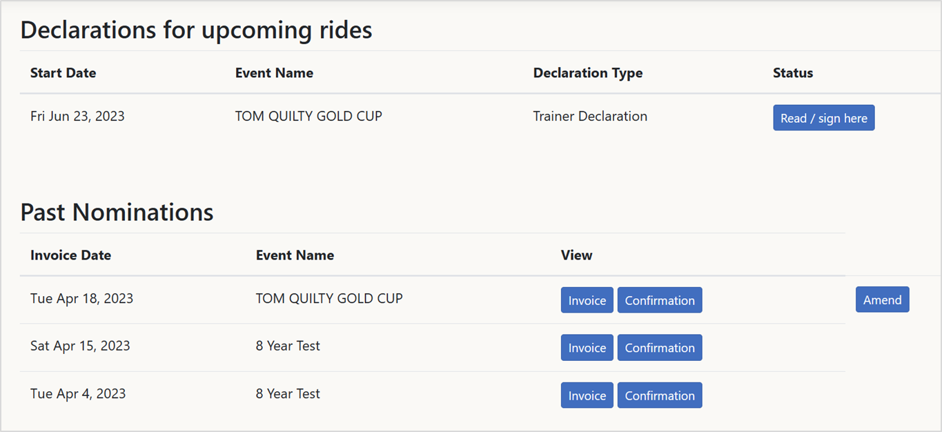 Select the My History menu item and, in the Past Nominations table, select the Amend button on the ride that you wish to cancel.
