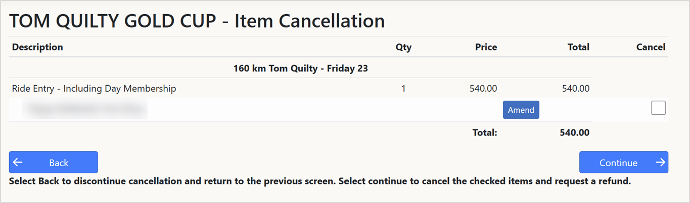Select the Cancel tick box to activate the cancellation and select the Continue button. A confirmation message will be displayed and you will now need to select the Confirm button to finalise the cancellation and refund request process.