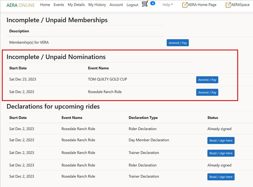 Once the rider is ready to finalise their nomination by paying the ride entry fee the rider can log into their AERA Online account again and navigate to the My History page. This will display an Incomplete/Unpaid Nominations section: