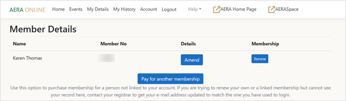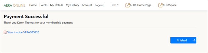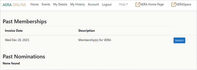 - The ‘My History’ menu option provides details of Past Memberships and a link to the invoice.