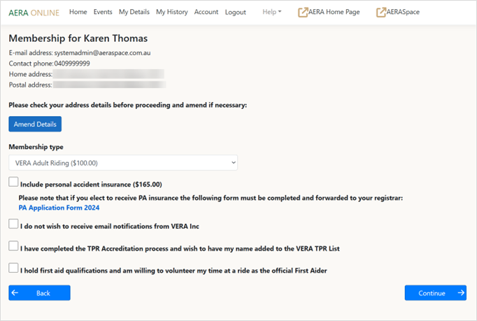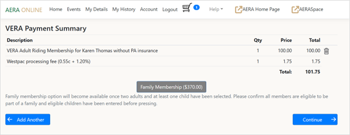 - This summary screen displays the Membership type selected and whether insurance has also been selected. The price for the Membership category will be displayed along with the Westpac processing fee payable and the total cost of the transaction. Family Membership details are provided. To add additional family members (who must have the same email address on their record in AERASpace to link) or to pay for someone else’s memberships renewal, select the ‘Add Another’ button. Select the ‘Continue’ button to navigate to the Acceptance of Declarations screen.