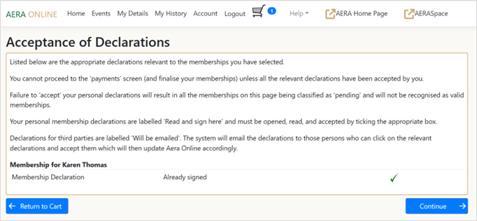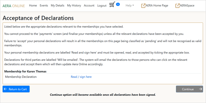 - The Acceptance of Declarations screen provides information on the Declarations presented, which vary depending on whether insurance has been selected and whether there is a Junior membership included in the renewal. Click on the ‘Read / sign here’ link to view the details of the declaration, confirm acceptance and continue. Progress to make payment will be unavailable until the Membership Declaration has been signed.