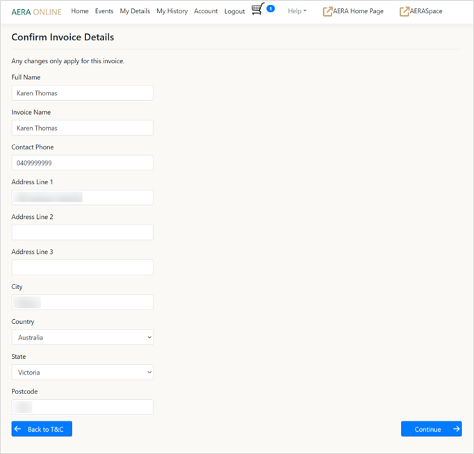 - Select the ‘Continue’ button to navigate to the Invoice Details screen which allows modification of the details printed on the invoice, for example, where a business is used to pay the membership renewal fee.