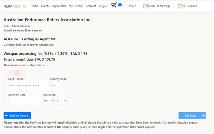- The Payment screen is displayed allowing entry of payment details. Navigation back to previous screens is available should an adjustment to the membership renewals details. The ‘Pay Now’ option will not be selectable until all payment information is entered and has been validated as correct. Details provided include the Westpac processing fee, the total amount payable and the GST status of the payment.